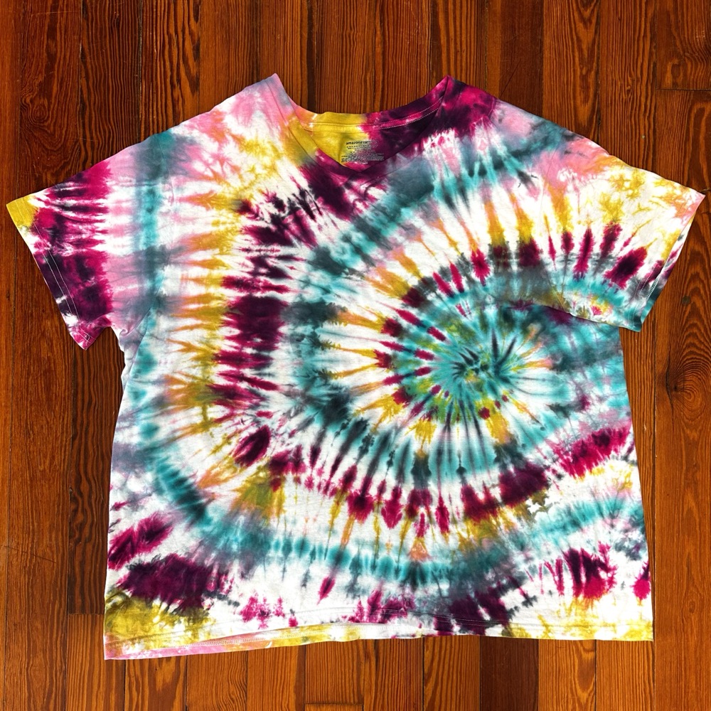 Been itching to try tie dyeing. First try: Beginner Chaos Pattern: simple off-set spiral Colors: teal, fuchsia, antique gold, black, and hot pink Second try: Beginner Nebula Pattern: simple crumple on a diagonal Colors: Violet, teal, fuchsia, black, and hot pink Third try: Cider Eclipse Pattern: simple off-set spiral Colors: Custom mix of fuchsia, antique…